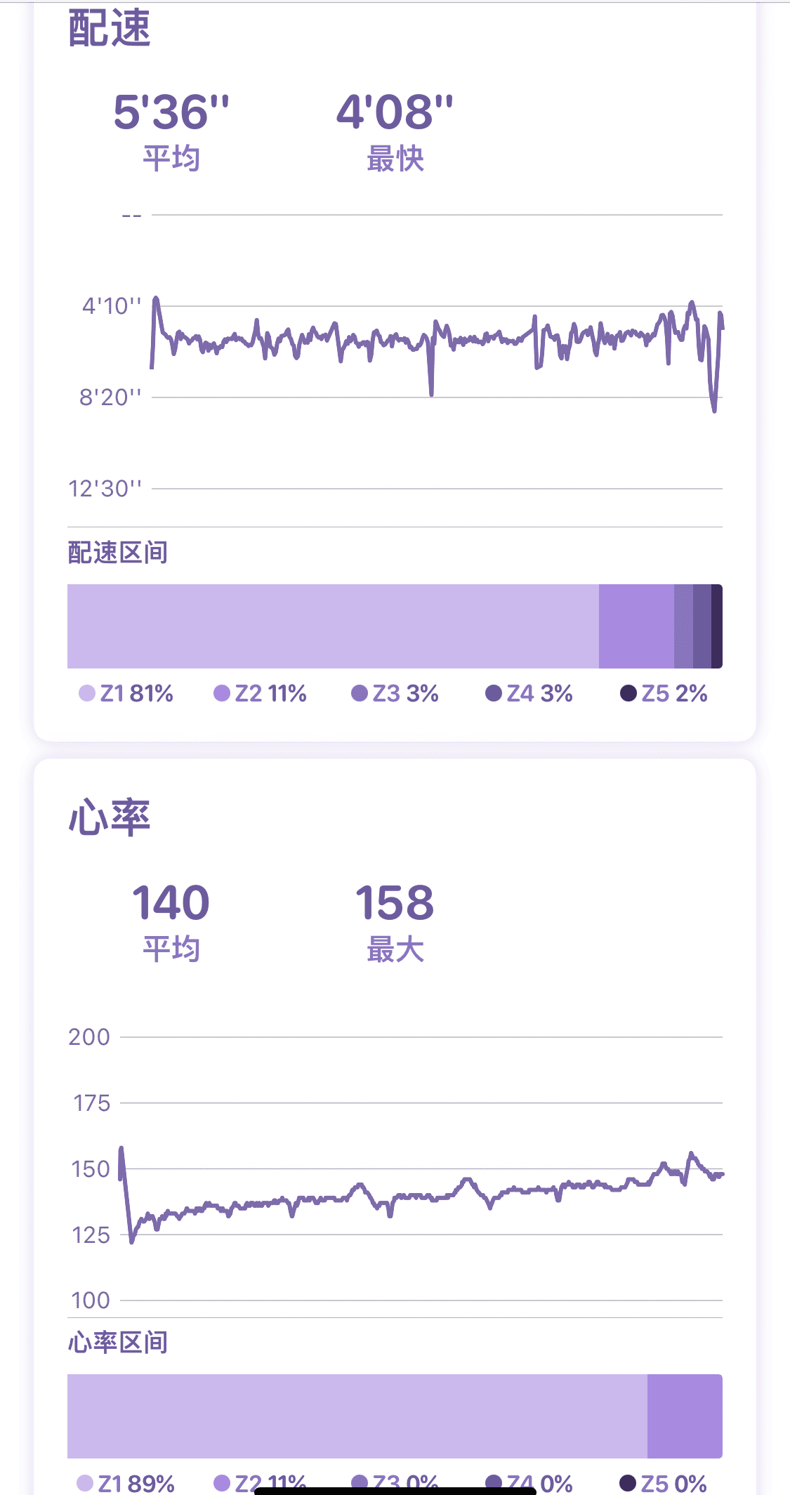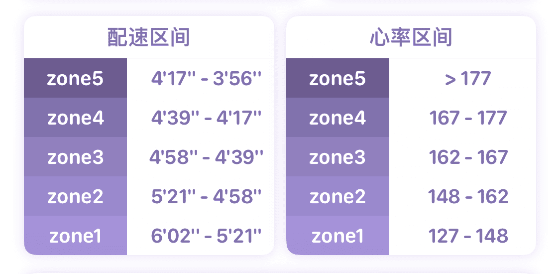 個人的なゾーンに従って全体の記録をセグメント化し、このトレーニングセッションで最も時間を費やしたゾーンを見ることができます—つまりトレーニングの焦点を特定します。一般的に言えば、ゾーン1は有酸素、ゾーン2はマラソンペース、ゾーン3は乳酸閾値などですが、ニーズに応じて異なるゾーンのトレーニング目的を調整するかもしれません。