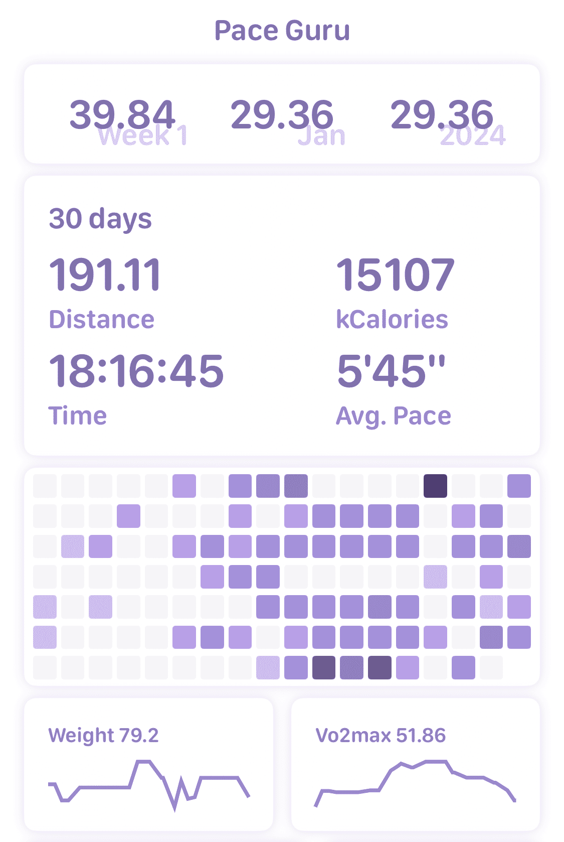 次の2つのセクションは30日間の体重と最大酸素摂取量(VO2 max)のカーブです。どちらのデータもApple Healthから直接取得されます。Appleは各ワークアウトの後にVO2 maxを更新するはずで、体重は手動で入力する必要があります。PaceGuruは体重詳細ページに体重データを追加するための小さな機能を含んでいます。毎日同じ条件下で測定することをお勧めします、たとえば起床直後の水を飲む前など。