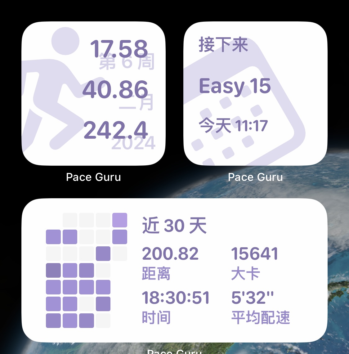 次は30日間のデータ集計です。私は個人的に毎月1日が新しいスタートのランニング統計方法があまり好きではないため、Pace Guruの計算方法は過去30日間でローリングします。私の個人的な目標は200キロメートルを維持することです。(広州マラソンの後の1か月、達成できなさそうな感じがします)