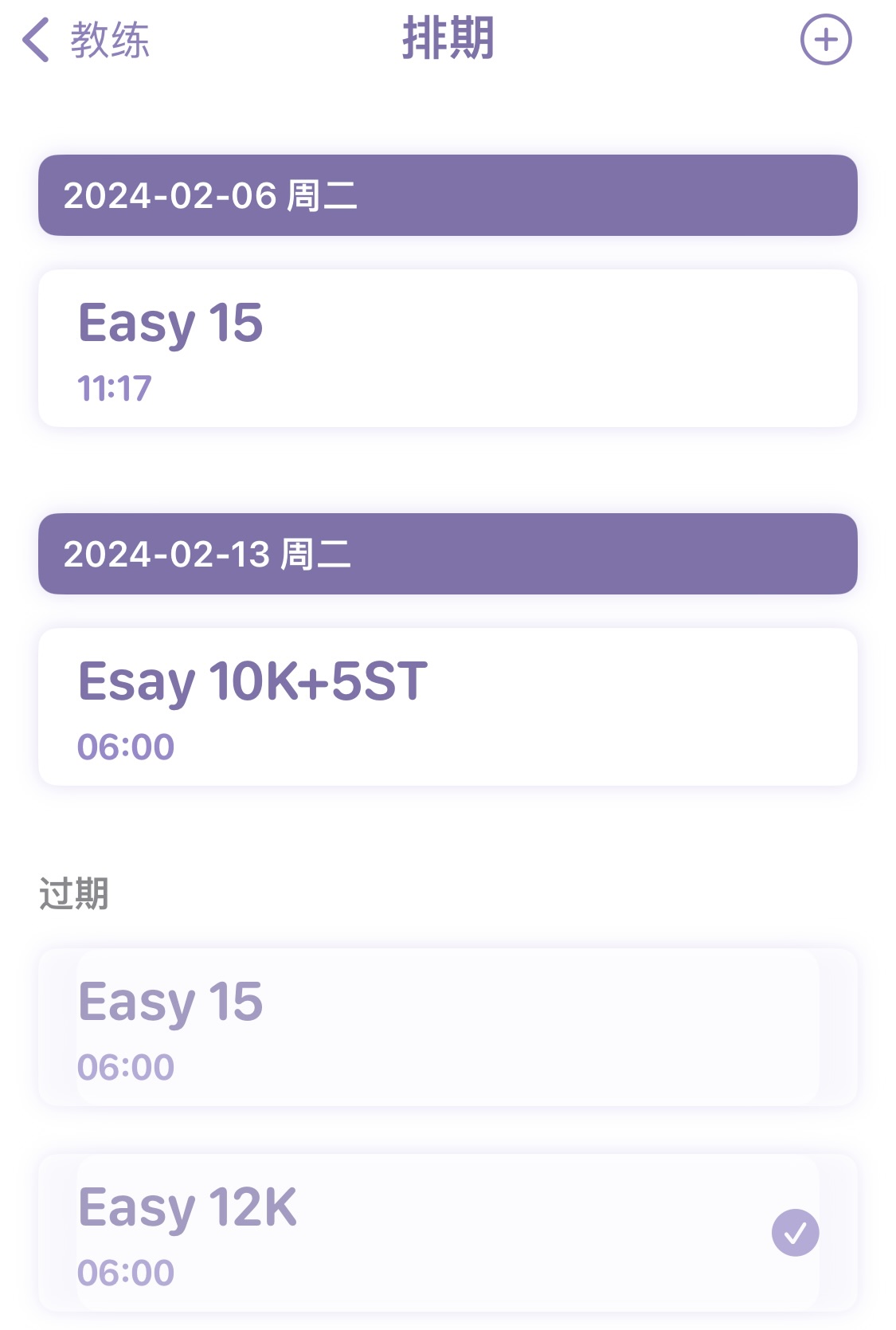 就进入了显示所有已排期的计划界面,在这里未来的计划排期按日期分组显示,在这个界面的右上角,有添加按钮,点击它则进行了对未来 10 天进行跑步计划的界面。